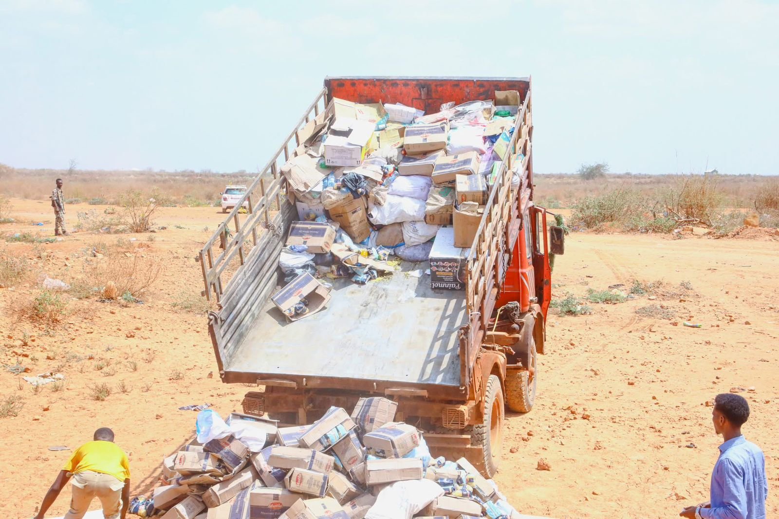 Baidoa, Somalia – The Baidoa District Administration on Saturday destroyed a large quantity of expired food products that had been confiscated from various markets in the city. The public destruction took place on the outskirts of Baidoa following a series of inspection operations led by the Department of Health and Sanitation under the local government.