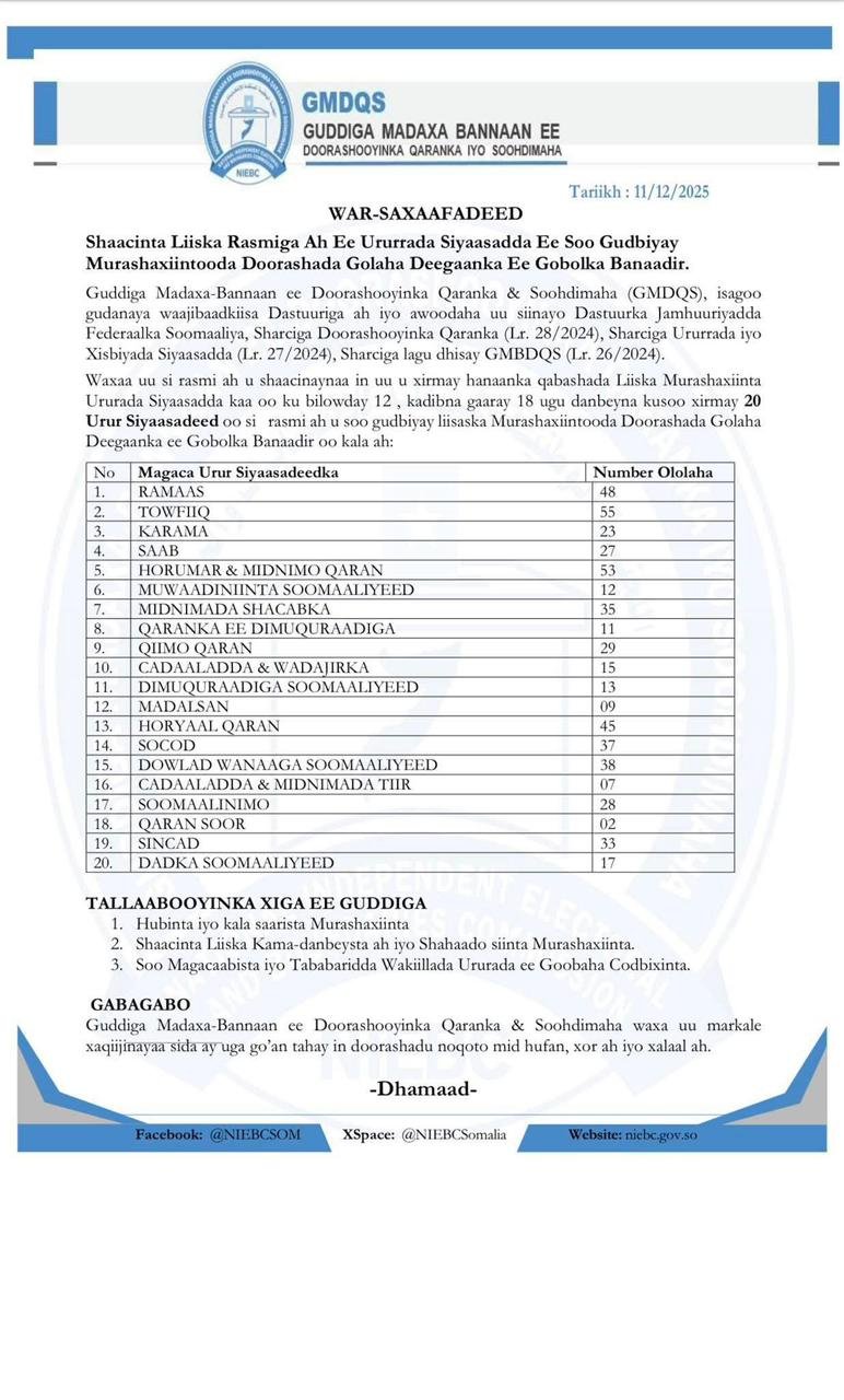 The National Electoral Commission has released the official list of political associations that have submitted candidates for the upcoming Banaadir Regional Local Council elections.