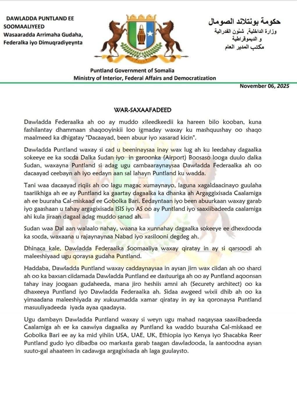 Garowe, Somalia – November 6, 2025: – The Puntland Government has strongly rejected recent statements issued by the Federal Government of Somalia and its allies, which alleged that Bosaso Airport was being used as a transit point for operations related to the ongoing conflict in Sudan. Puntland described the remarks as “false, provocative, and a deliberate attempt to undermine the region’s security achievements.”