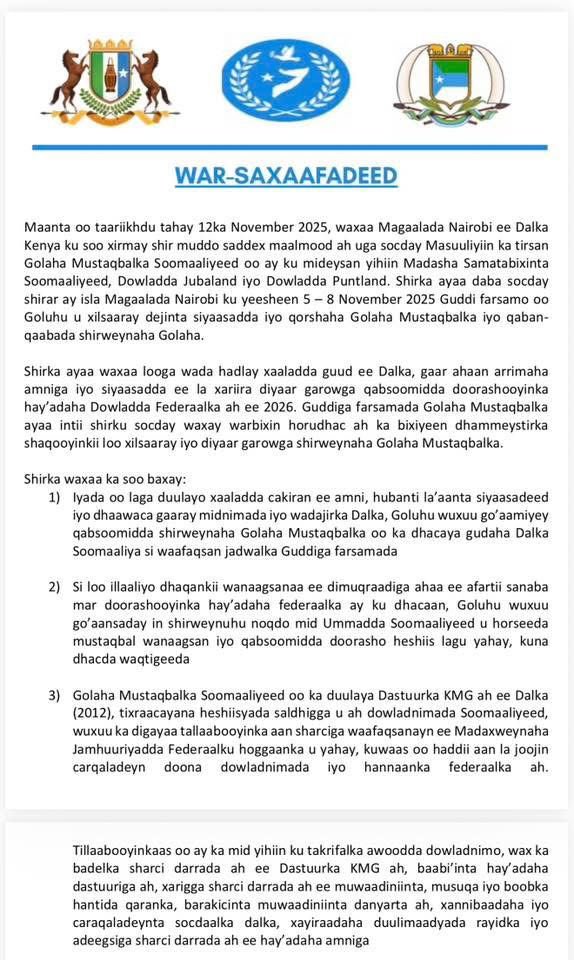 Nairobi, November 12, 2025 — The Somalia Future Council (Golaha Mustaqbalka Soomaaliyeed) has issued a strong statement rejecting four key actions allegedly being pursued by the Federal Government of Somalia, declaring them “null and void” and contrary to the national interest.